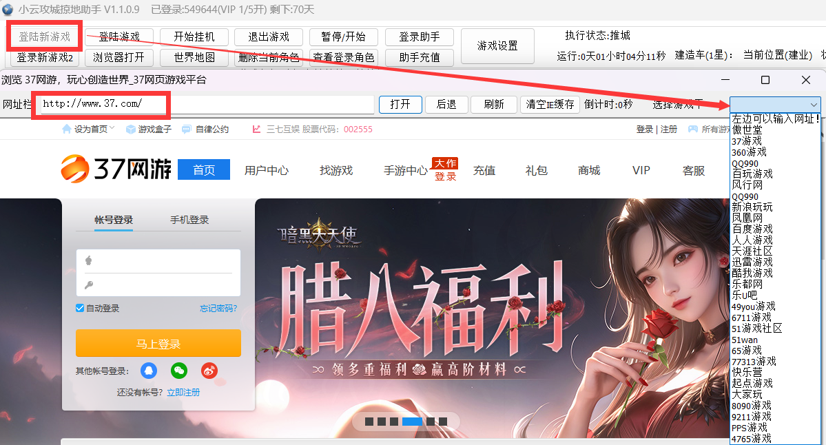 首次在助手上登录新的游戏角色请点 “ 登录新游戏 ” 来打开浏览器,浏览器右上角选择游戏平台(可以复制游戏网址到浏览器左侧的网址处打开)来登录角色。